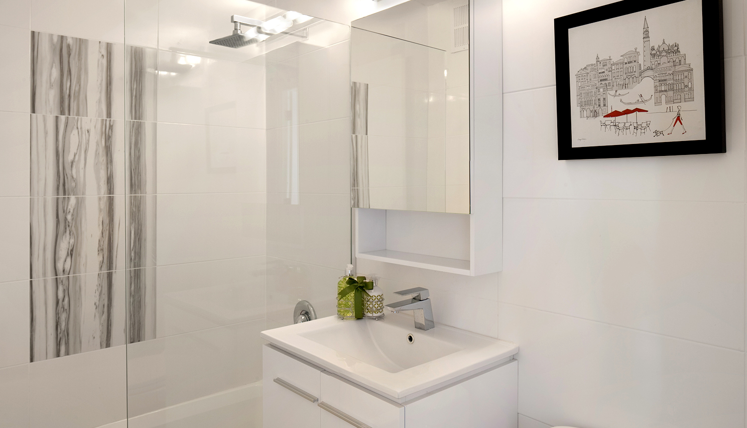 • Quartz countertops with marble backsplash
